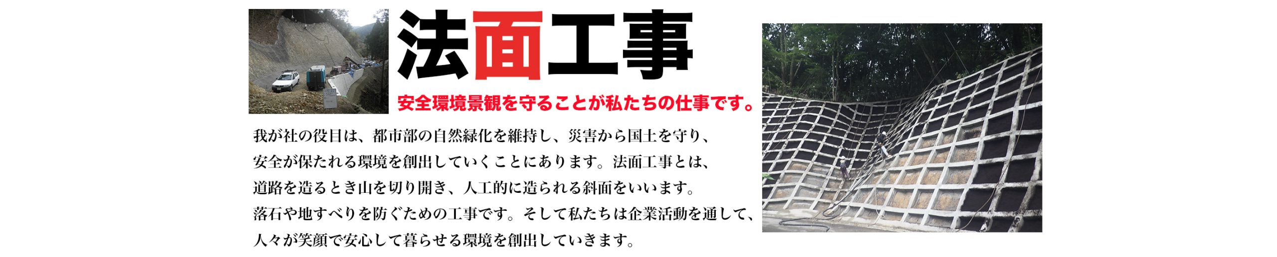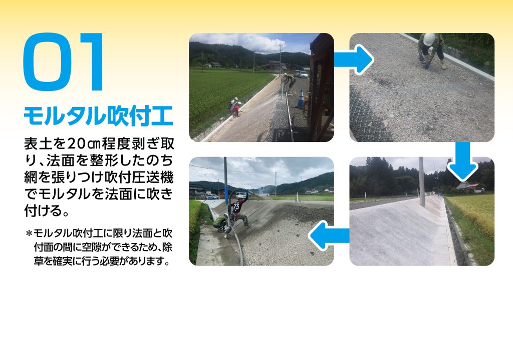 表土を20cm剥ぎ取り、法面を整形したのち網を貼り付け吹付圧送機でモルタルを地面に吹き付ける。 モルタル吹付工に限り法面と吹付面の間に空隙ができるため除草を確実に行う必要があります。