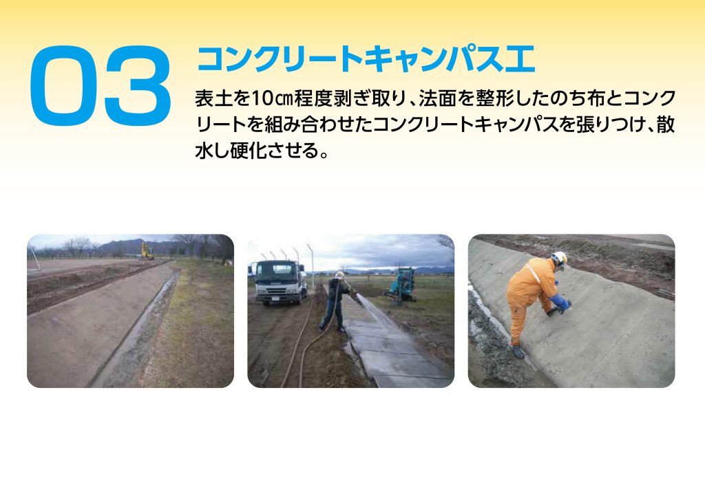 表土を10cm程度剥ぎ取り、法面を整形したのち布とコンクリートを組み合わせたコンクリートキャンパスを張りつけ、散水し硬化させる。