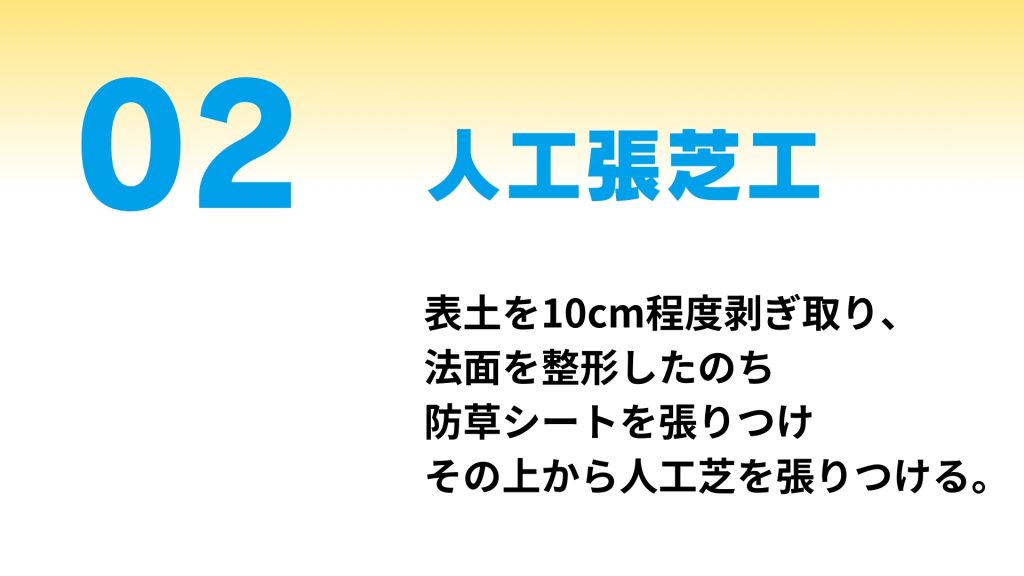 表土を10cm程度剥ぎ取り、法面を整形したのち防草シートを張りつけその上から人工芝を張りつける。